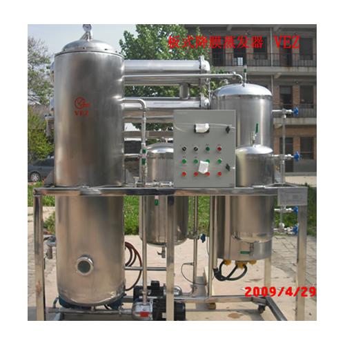 ① 由于加熱蒸發(fā)為平面大板,被加熱介質(zhì)在板片上沉積的垢片會因生產(chǎn)中溫度變化和降膜沖刷自動剝落,大大降低了垢層熱阻,能使加熱元件保持良好的熱傳導(dǎo)性能。單效蒸發(fā)器蒸發(fā)強度可達(dá)1:80,即每平方米加熱面積可蒸發(fā)水分80Kg。